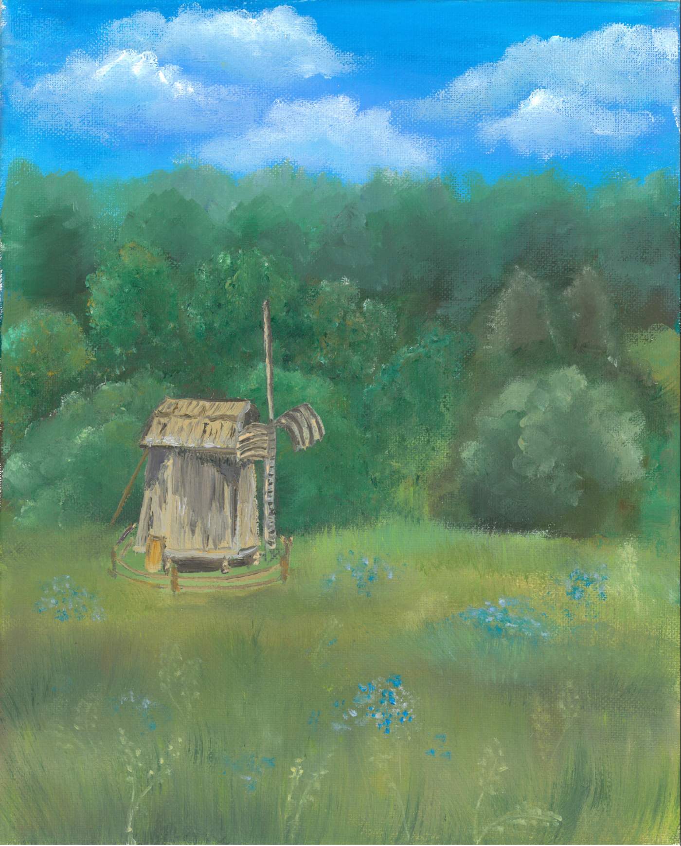 Мельница на Пушкинских горах, масло, тематика «Малая родина», автор: Юлия Владимировна Попова, начальник финансово-аналитического отдела Сыктывкарского государственного университета имени Питирима Сорокина.